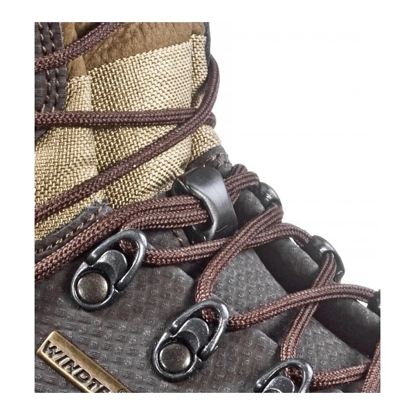 Bota de cuero natural hidrófugo de una sola pieza con tratamiento de poliuretano que le da un efecto poroso protegiendo el calzado de las zarzas y las piedras. Muy ligera. Ideal para la caza.