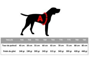 Para elegir la talla del chaleco, mida el contorno A de su perro, según se muestra en la imagen, correspondiente a la parte más ancha de la caja torácica. La longitud en centímetros de la circunferencia de pecho A corresponde a la talla: