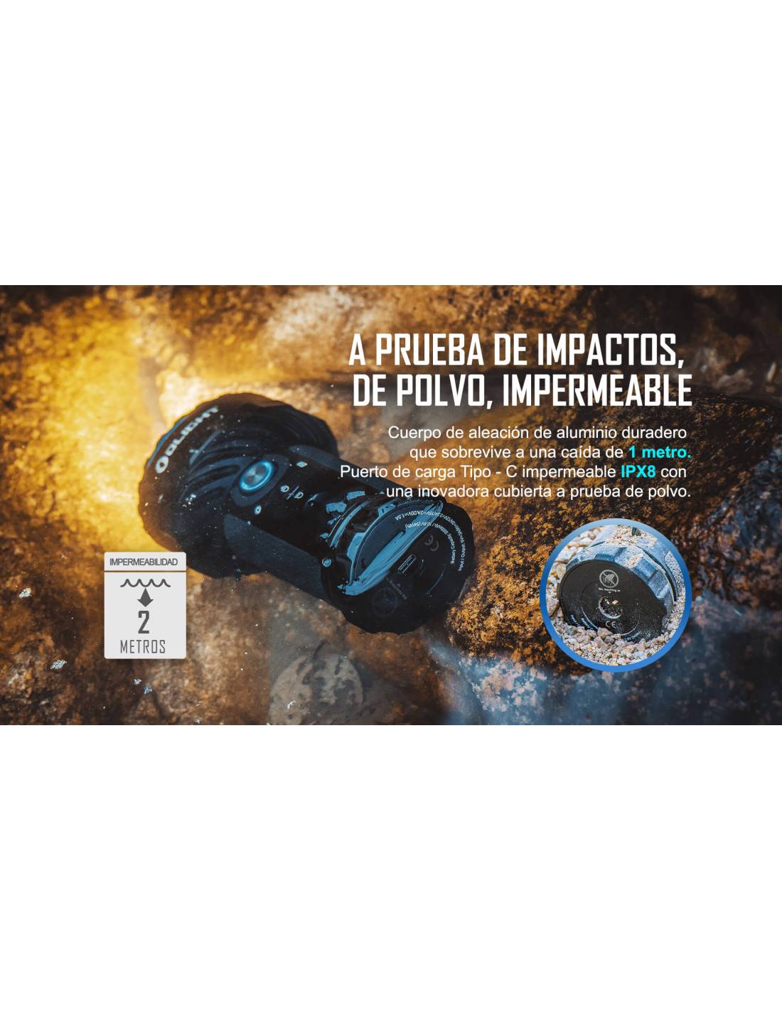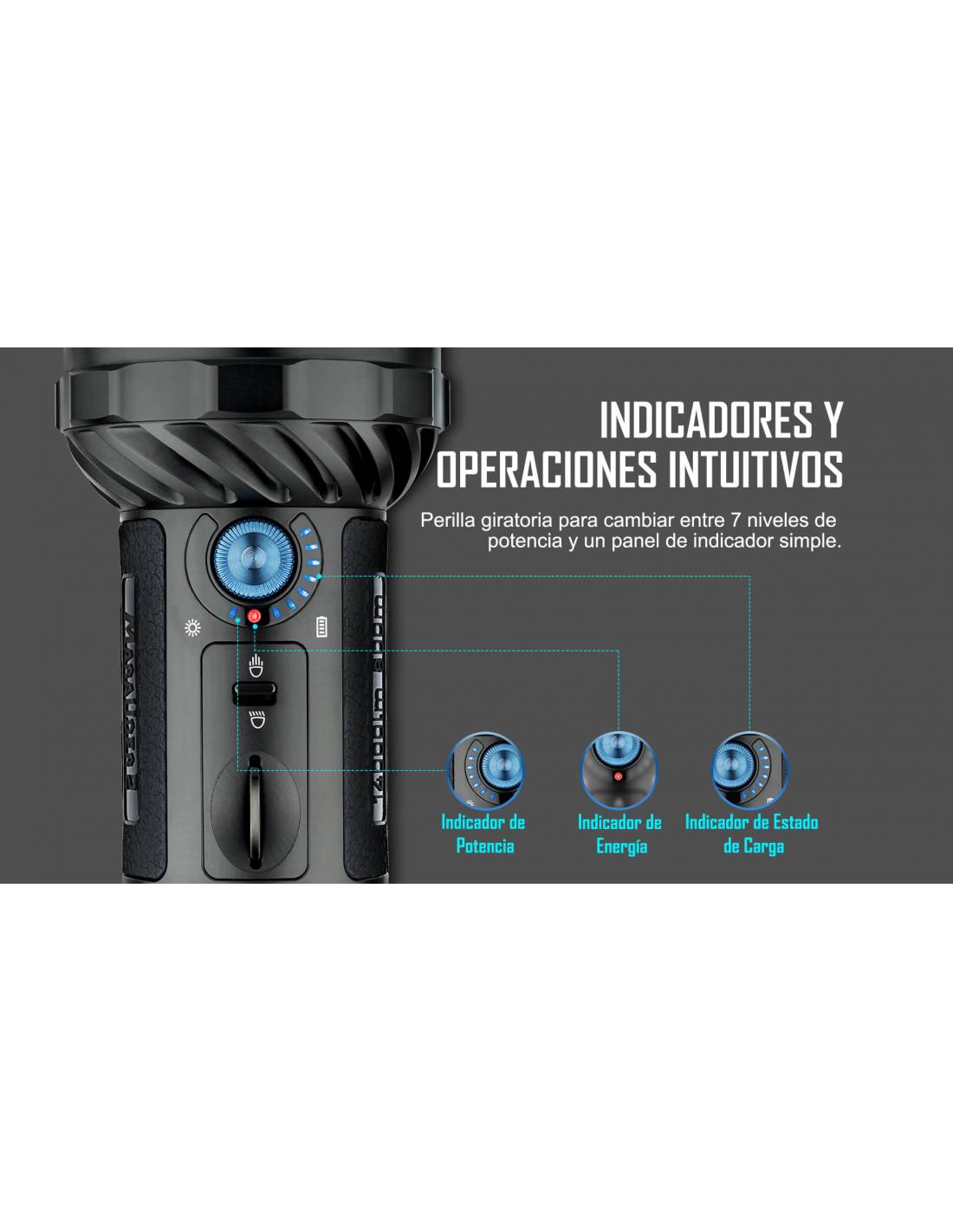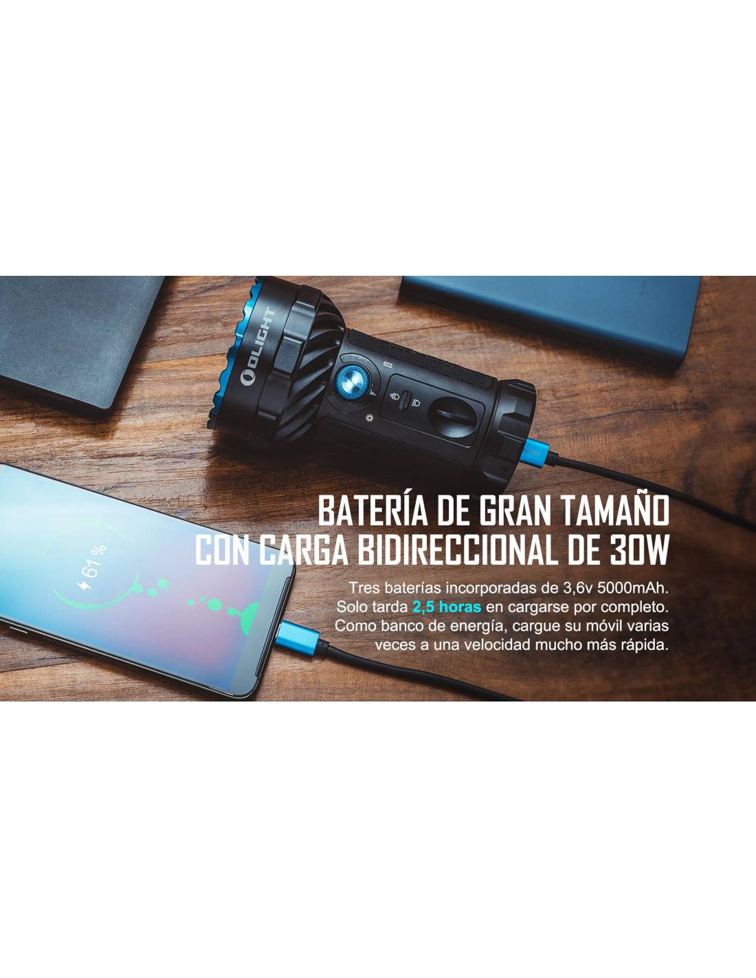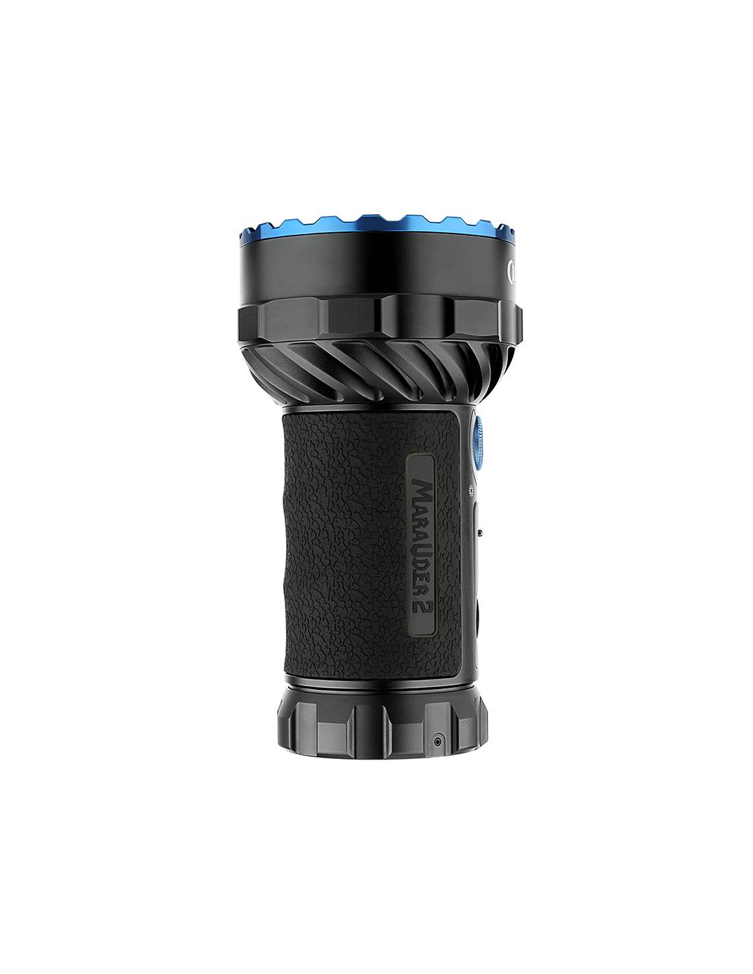 El Marauder 2 de Olight con carcasa color negro, es una versión mejorada del X7R Marauder. Se ha agregado un LED grande en el centro de la cabeza para permitir un haz de luz de 800 metros, y 12 LED pequeños rodean el borde para crear un haz de luz de 14.000 lúmenes.